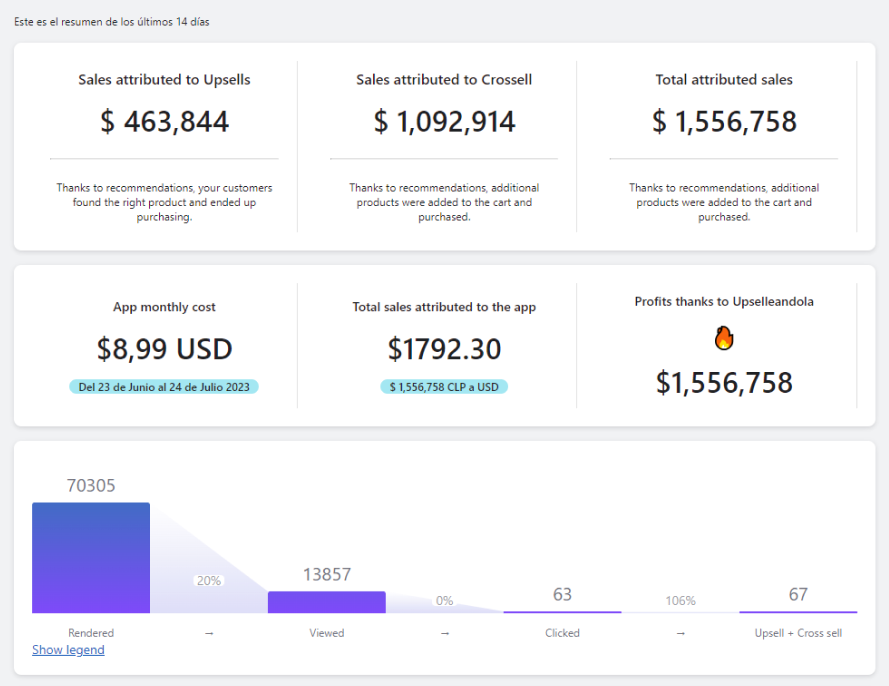Ten estadísticas en tiempo real de cuanto te cuesta la aplicación vs cuanta venta te trae. Mira el funnel completo de las veces que aparece y cuantos aceptan tus ofertas